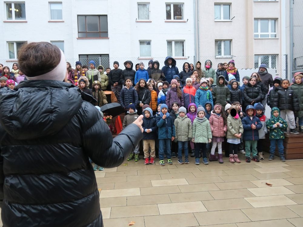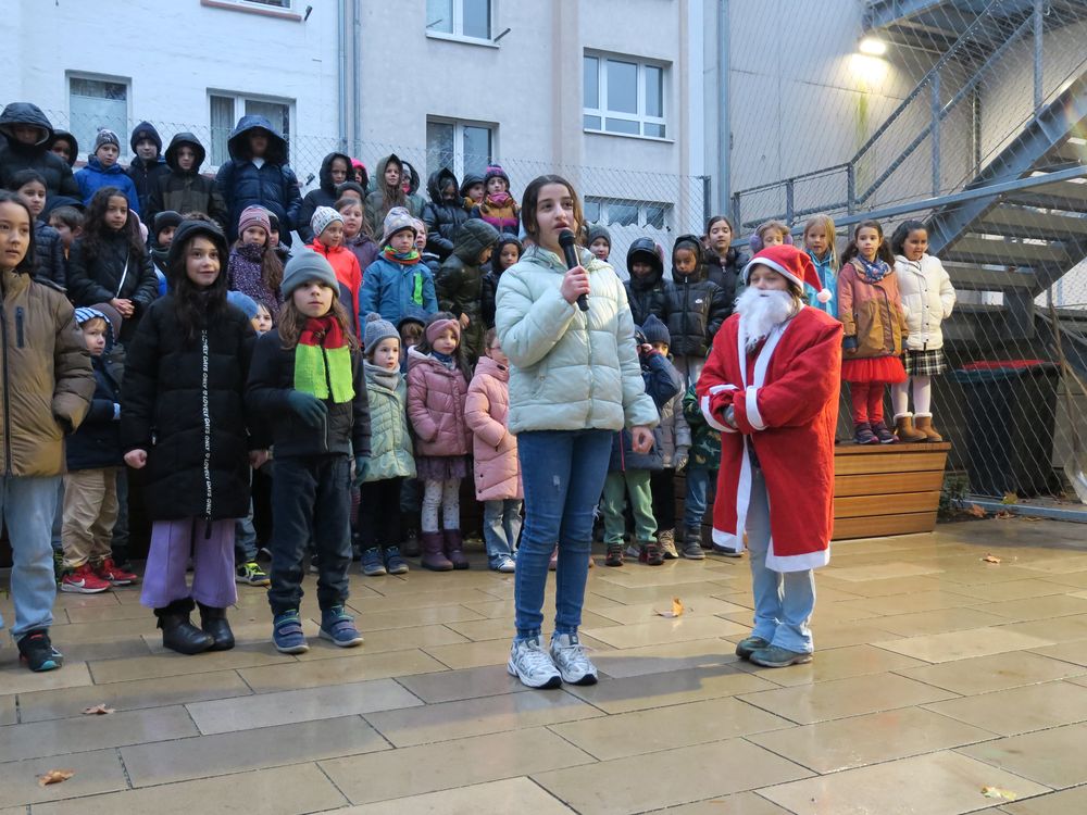 Am Freitag, den 28.11.2025 fand auf dem Schulhof der Leibnizschule der diesjährige Adventsmarkt statt. Alle Kinder sangen gemeinsam als Schulchor und eine vierte Klasse präsentierte dabei weihnachtliche Gedichte.