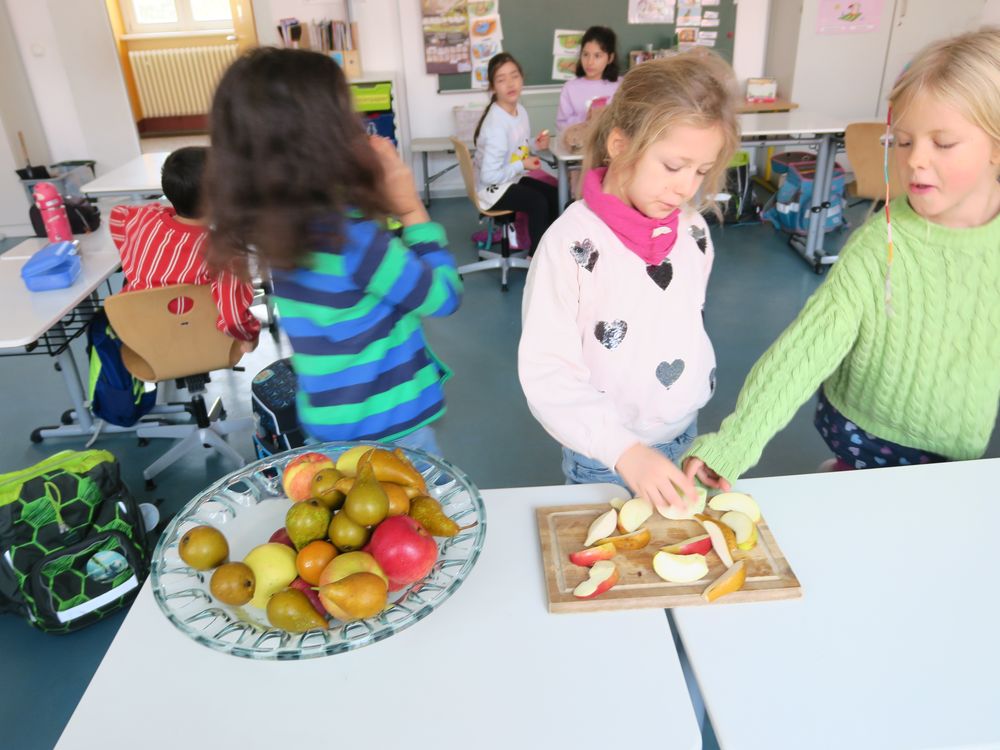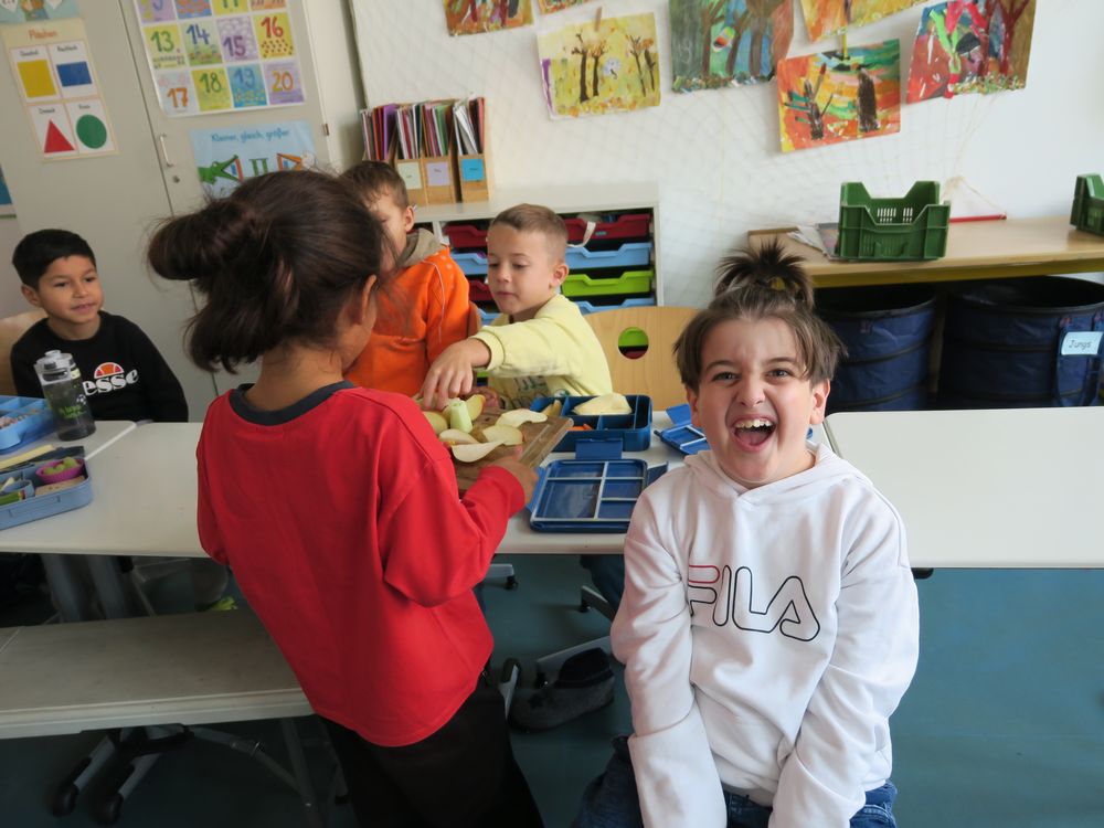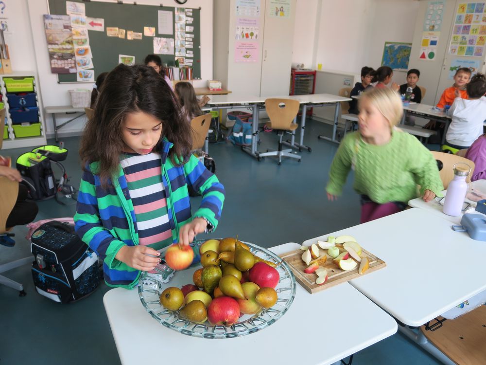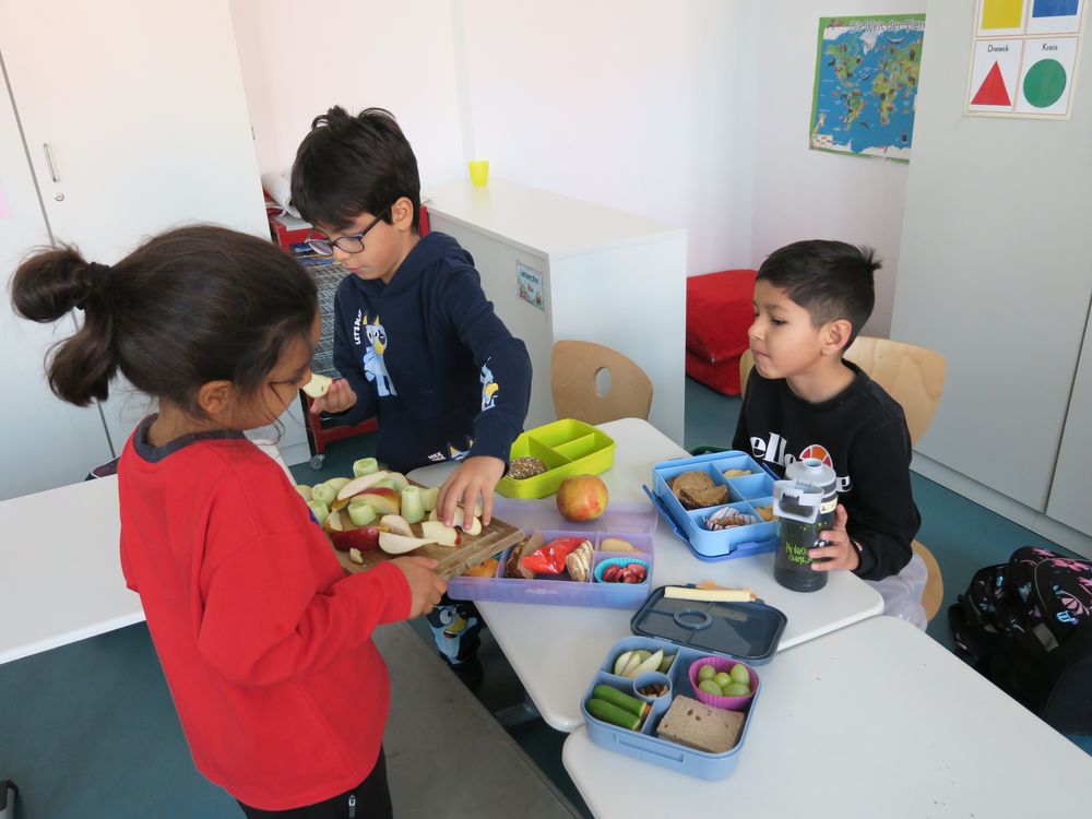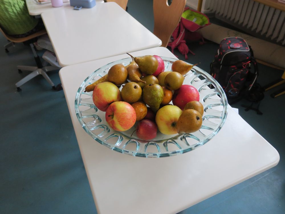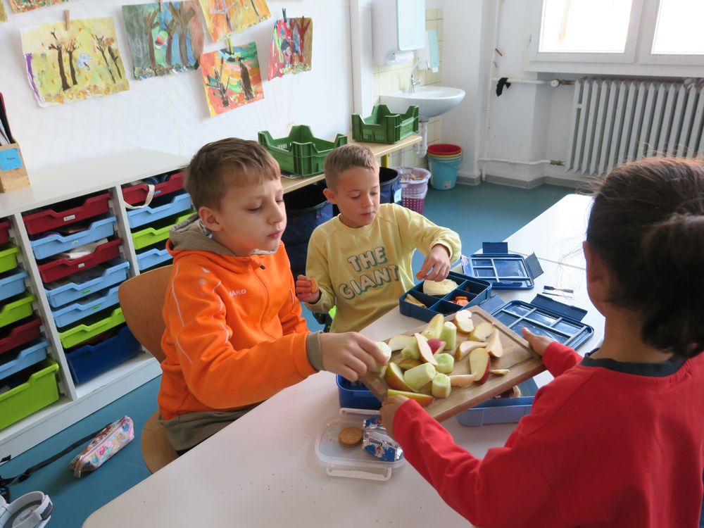 In der Frühstückspause verteilen wir das geschnittene Schulobst.