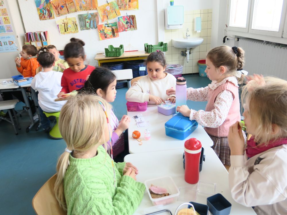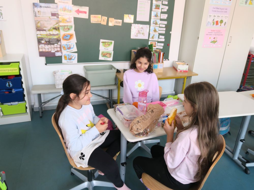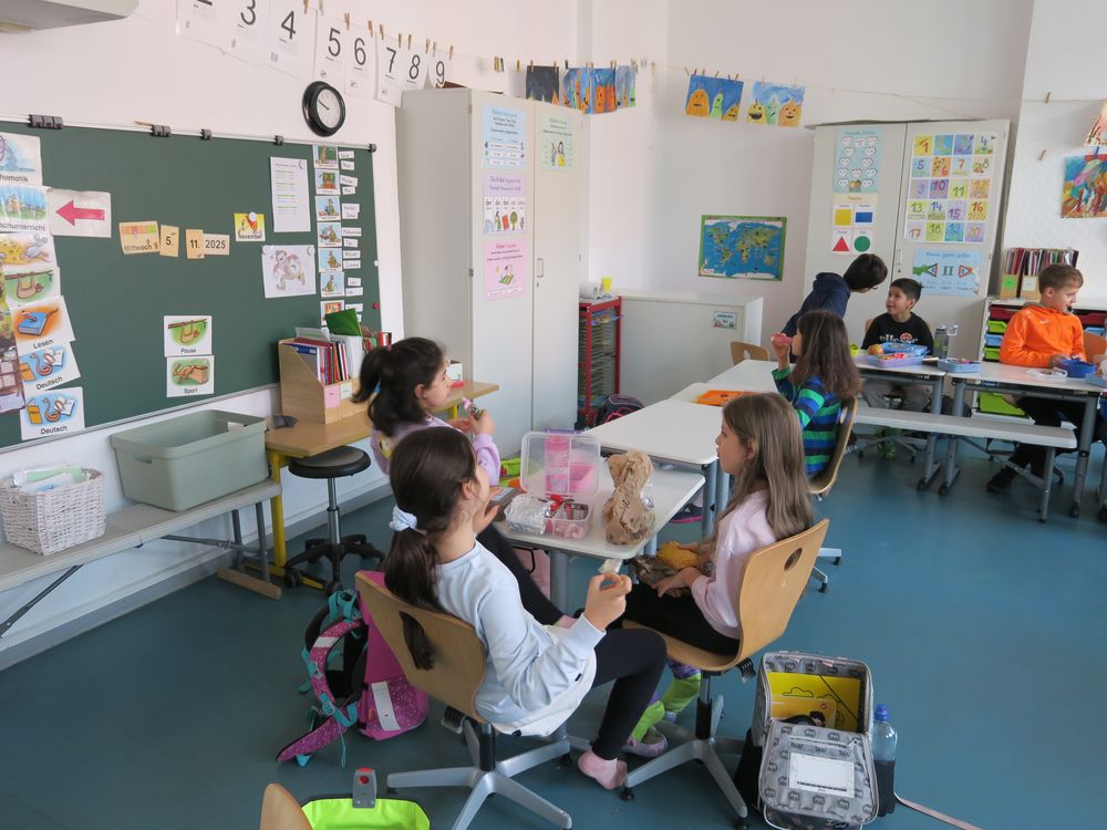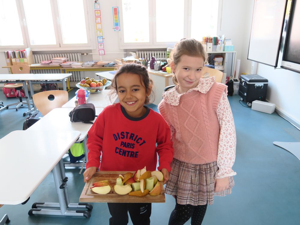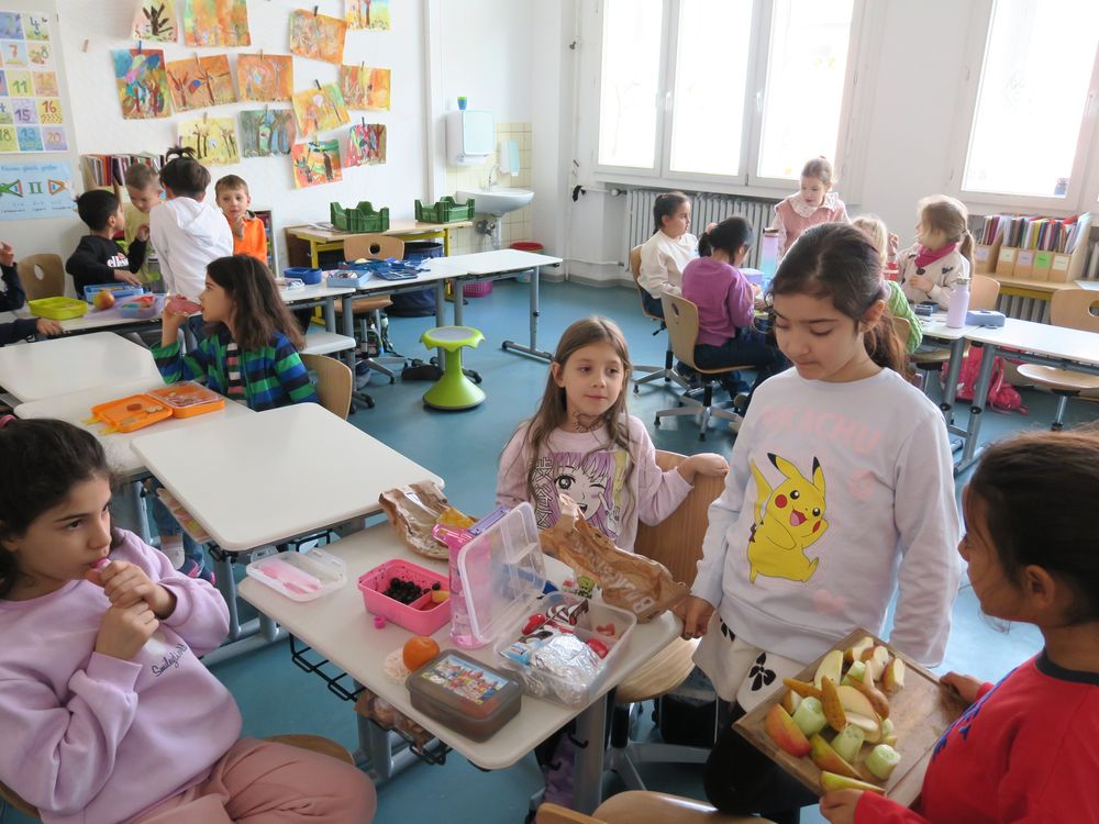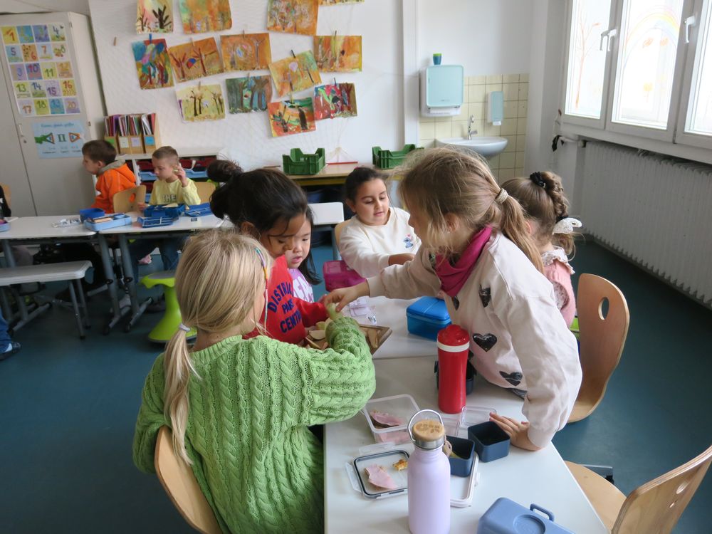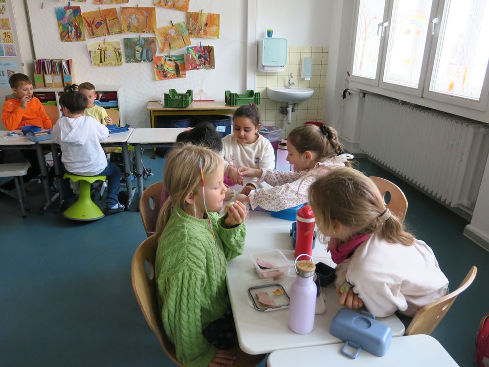 In der Frühstückspause verteilen wir das geschnittene Schulobst.